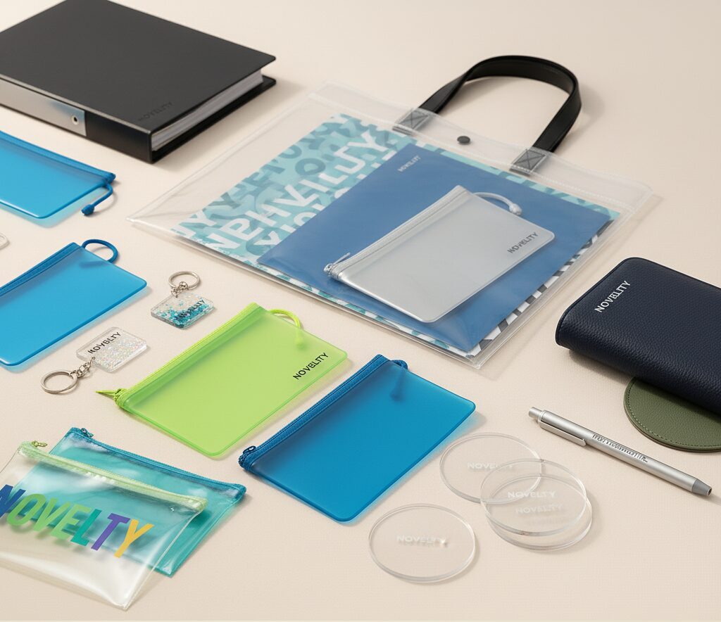 記念品PV製のスコアブックカバーにロゴマークを型押し、ボールチェーンはリング付きのもので制作。