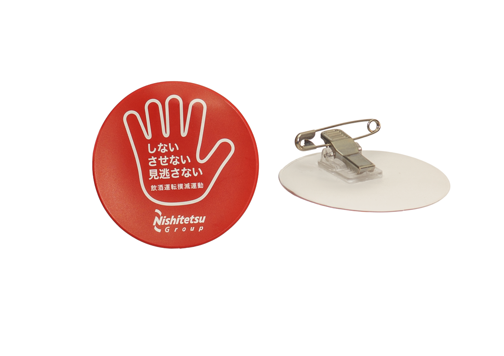 ビニール素材に印刷を入れ、背面にピン付きクリップをつけました。